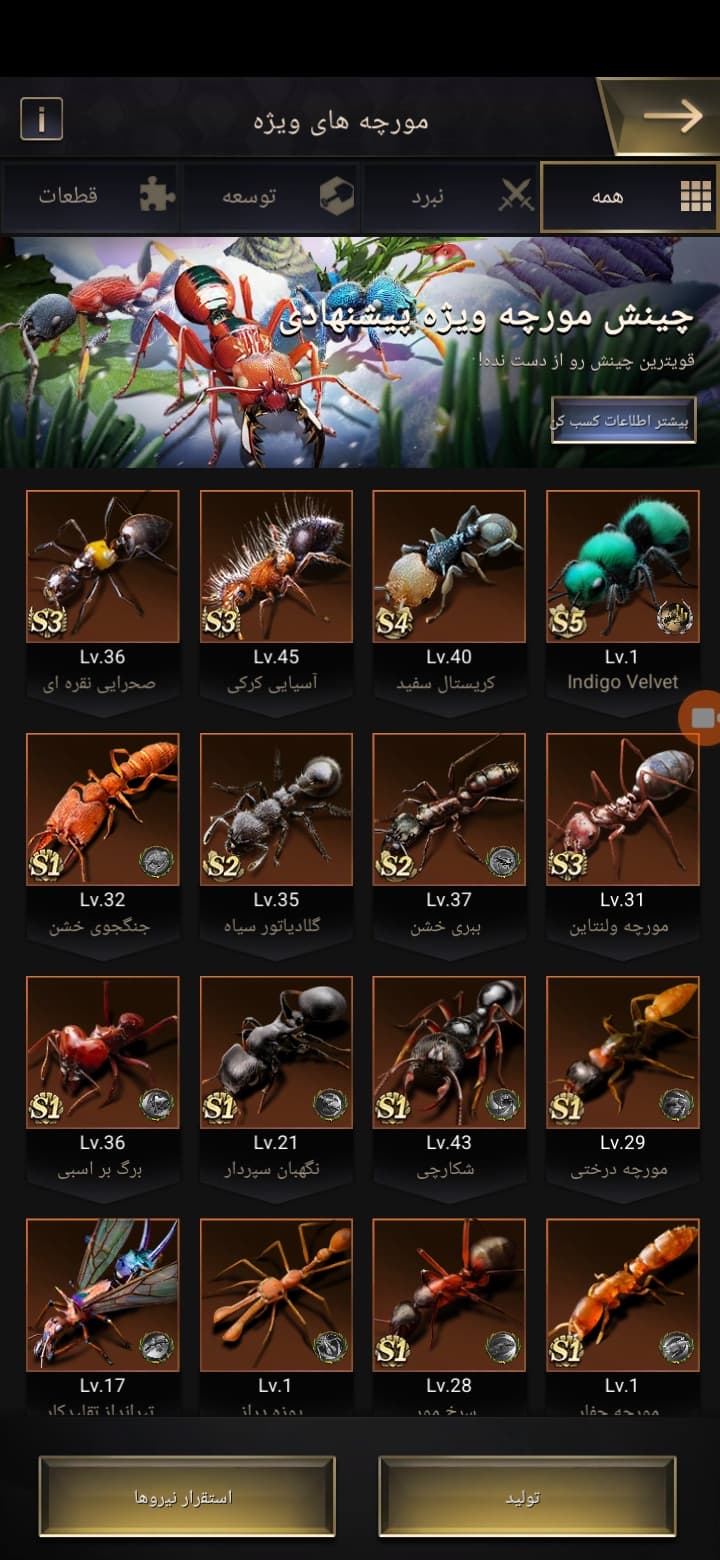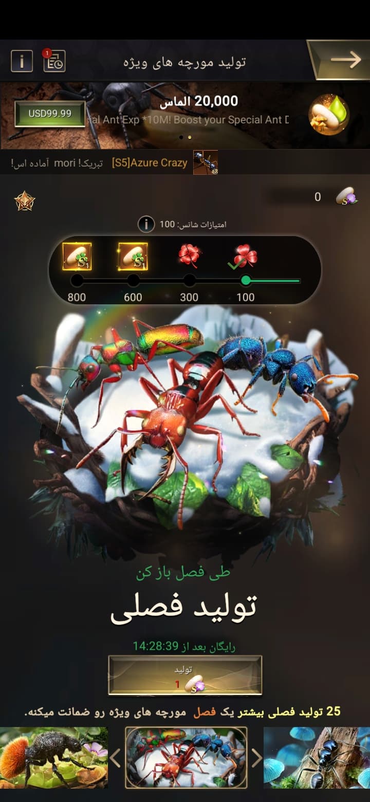 اما توصیه می کنم تا وقتی پوسته مورچه را دریافت نکردید از شبدر استفاده نکنید . چون برای استفاده از شبدر اول باید مورچه را پوسته کنید و اگر مورچه ای که شبدر بهتون میده مناسب نباشه و تایید نکنید مورچه فصلی شما در پوستها باقی خواهد ماند . و شبدر احتمال داره به شما با یک ورژن پایین تر بده . مثلا S5 را بدید و شبدر بهتون S4 بده . پس شبدر را نگهدارید هر وقت پوسه S5 گرفتید که به ترکیب شما نمی خوذد . اون وقت شانس شبدر را امتحان کنید