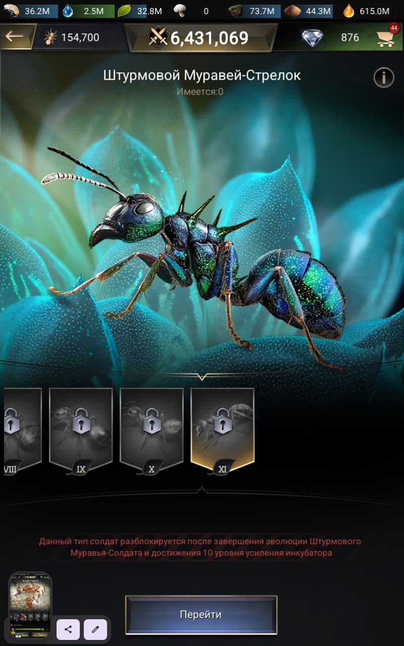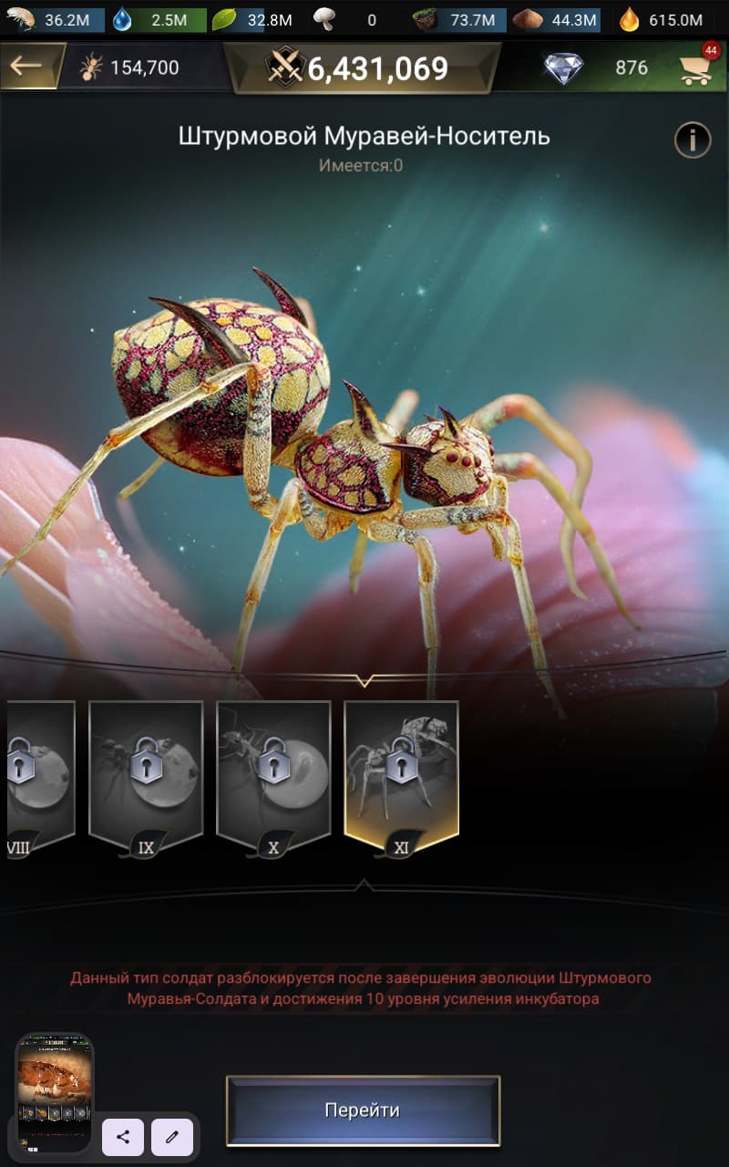 Завершить эволюцию: Вам нужно полностью изучить ветку эволюции «Штурмовые Муравьи-Солдаты». Это разблокирует возможность вылупления Штурмовых Муравьев-Стрелков, Охранников и Носителей.